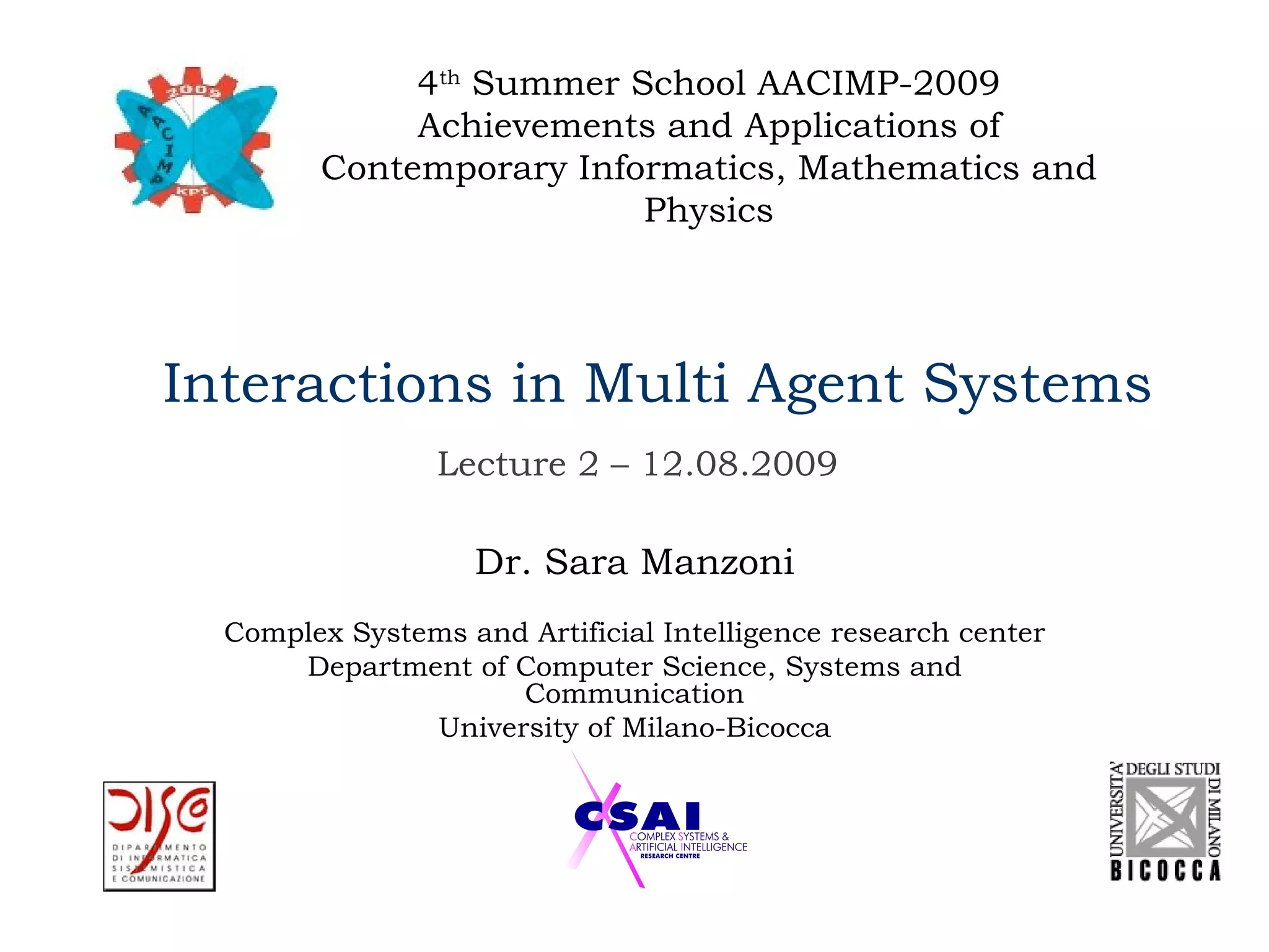 The document discusses the design and modeling of multi-agent systems (MAS), highlighting their capabilities to interact and collaborate in structured environments to achieve common goals. It categorizes types of interactions, such as cooperation, competition, and collaboration, and explores the significance of communication and resource management among agents. Various interaction models, including direct and mediated interactions, are examined alongside their advantages and challenges in facilitating effective agent communication.