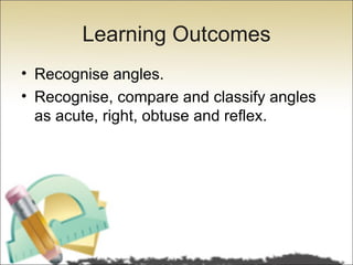 - Examples of finding different angles in the classroom and words are provided to help students identify each type of angle.