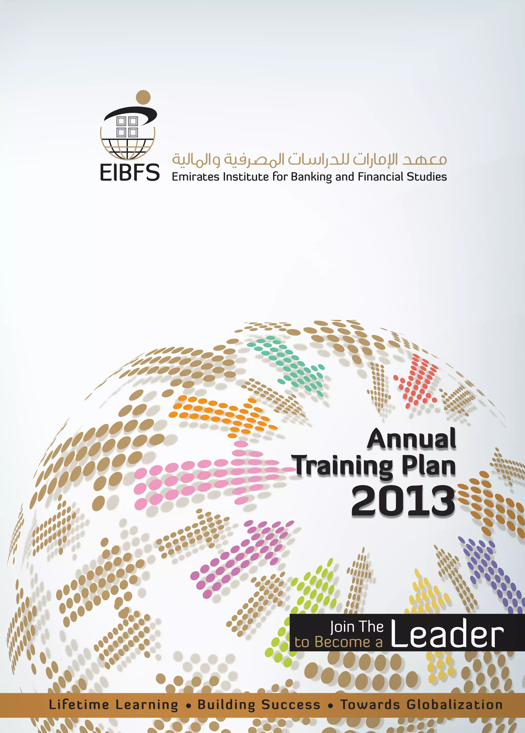 The document is the 2013 annual training plan for the Emirates Institute for Banking and Financial Studies (EIBFS). It provides an overview of the new programs and features being offered in 2013, including expanded course offerings in Dubai, new e-learning programs, leadership development programs, and a specialized certificate in retail banking. The chairman's and general manager's messages emphasize supporting the banking and finance sector through continuous skills upgrading and innovative programs to meet industry needs. The plan aims to qualify professionals and support the growth of the UAE economy.