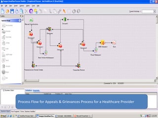The document describes the process flow for appeals and grievances for a healthcare provider using Newgen's Customer Communication Management solution. The process involves appellants registering appeals/grievances via various channels. A data entry agent then enters the details into Newgen's CCM solution, triggering an auto-generated acknowledgment email. A reviewer makes an approval/exception decision and the committee makes the final call. An approval letter is generated and sent to the appellant if approved.