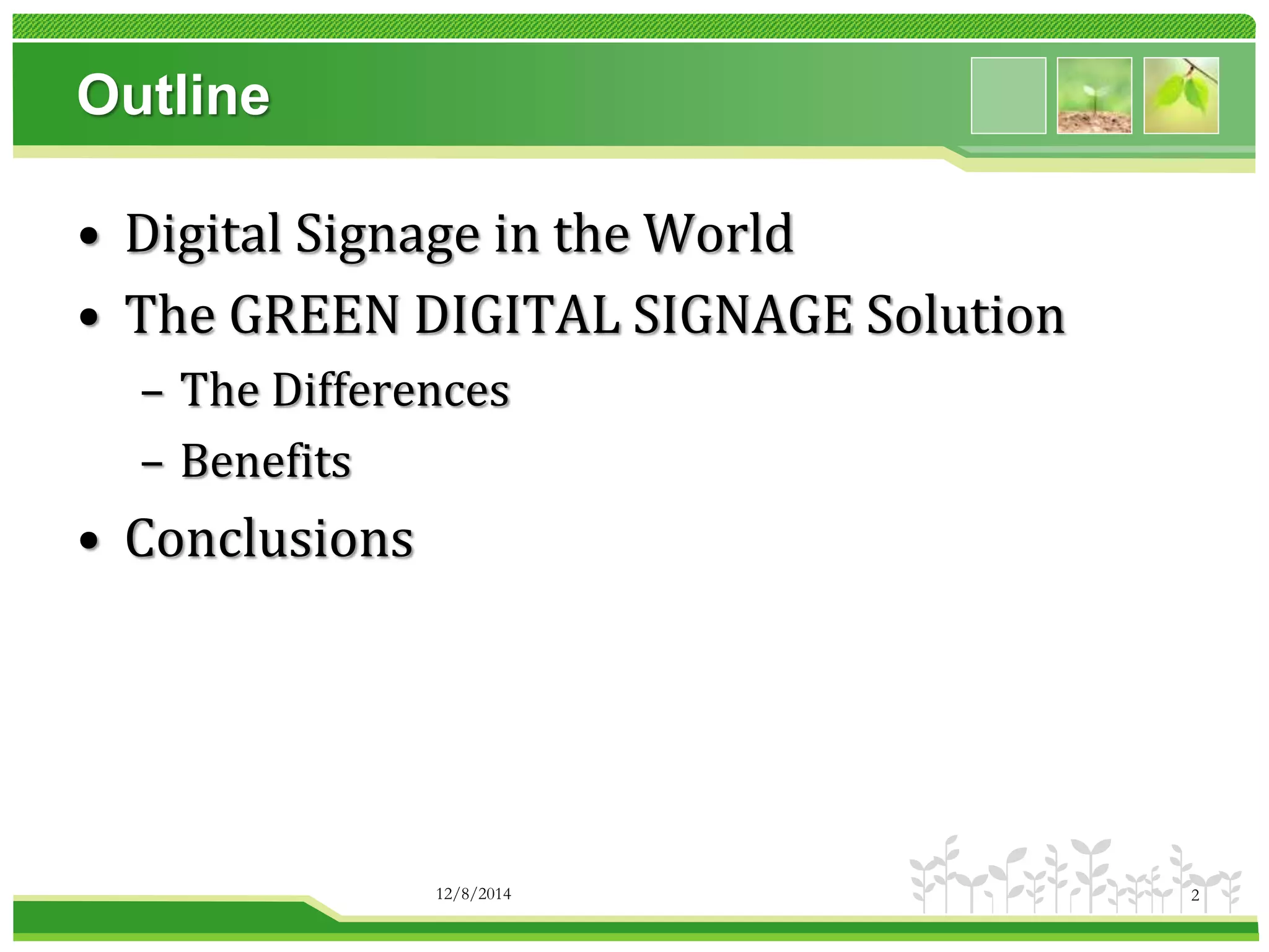 The document introduces Green Digital Signage (GDS) as an innovative platform that offers interactive, gesture-enabled digital signage solutions designed to enhance customer engagement and brand promotion. It highlights the various applications of GDS, including virtual reality, interactive galleries, and integration with mobile commerce, while emphasizing its energy-saving, multi-purpose features. The advantages of GDS over traditional digital signage include improved customer experience and increased revenue opportunities for businesses.