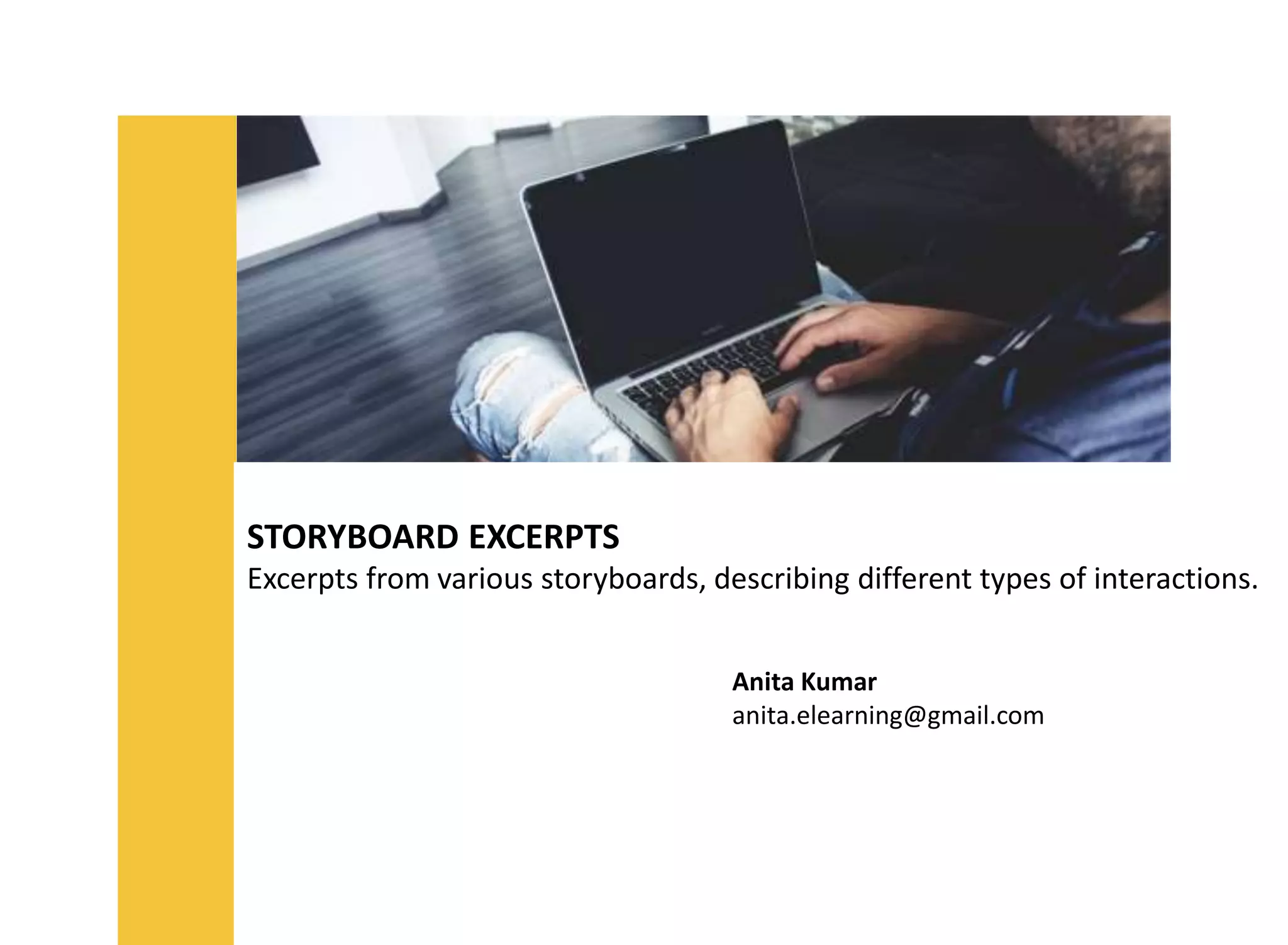 The document provides excerpts from various storyboard interactions that can be used for eLearning including: