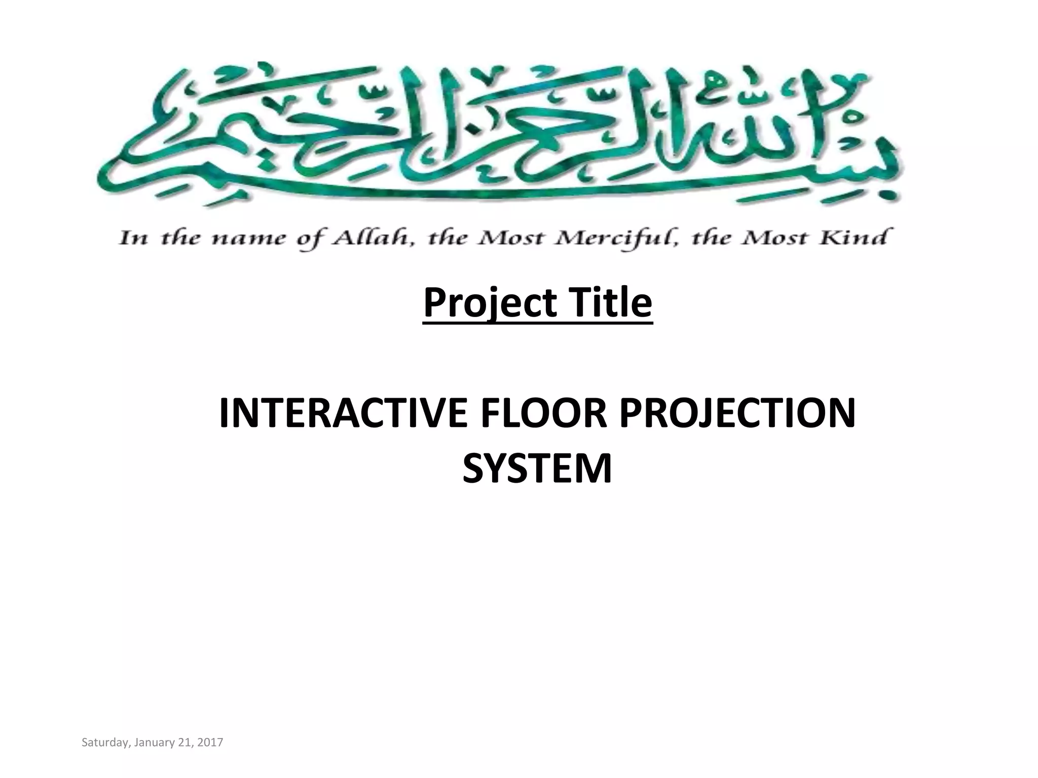 The document outlines a project for creating an interactive floor projection system that uses a Kinect sensor to detect objects and trigger animated visuals on the floor. Key components include software installations, sensor interfacing, and blob detection algorithms for object interaction. It discusses the detailed process of animating and controlling virtual elements in response to user presence, as well as limitations related to range and resolution of sensors.