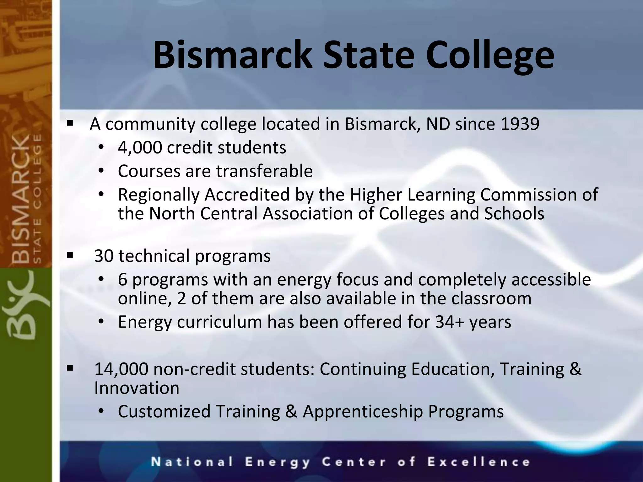 Bismarck State College (BSC) offers a variety of energy-focused educational programs, both online and in-class, catering to approximately 4,000 credit students and 14,000 non-credit students. The National Energy Center of Excellence at BSC features cutting-edge facilities and has been recognized as a premier national training center for energy industry operators. Partnerships with community colleges and industry provide blended learning opportunities, including hands-on lab competencies and online simulations.