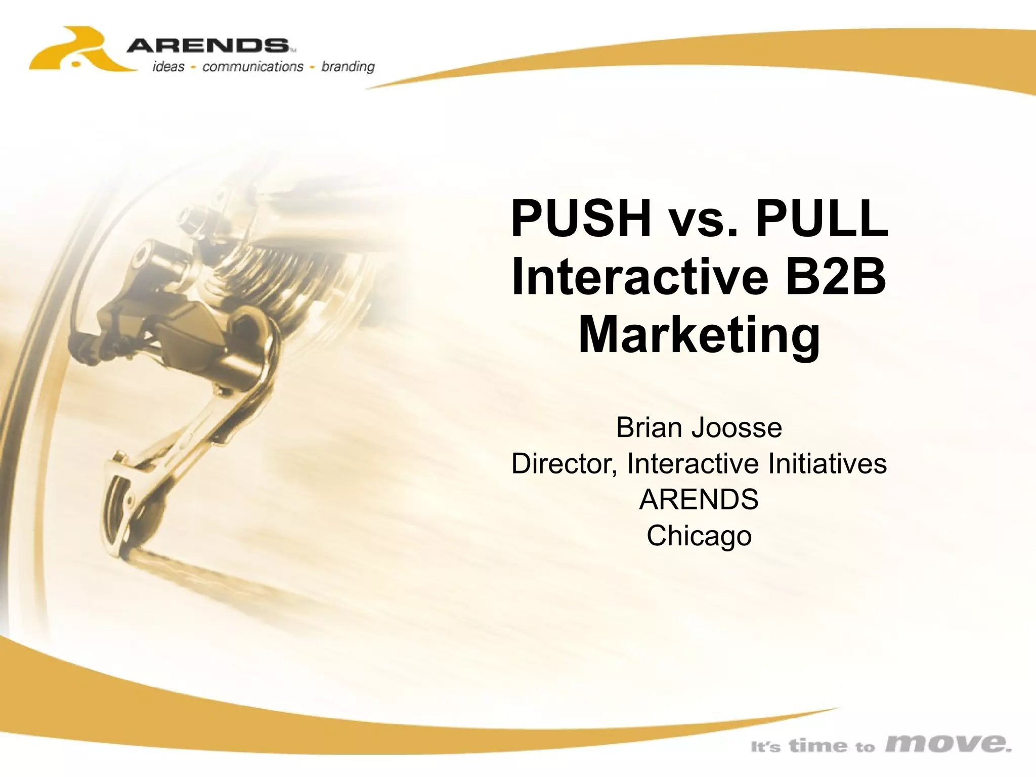 The document discusses the differences between push and pull marketing strategies in an interactive B2B context. It argues that pull strategies, which respond to already interested customers, are better suited for the web as users want control and can't be forced to engage. It provides examples of pull tactics like search engines, directories, and content tailored to different customer stages in the buying process. Metrics like leads, site traffic, and online sales are suggested to measure the success of pull strategies.