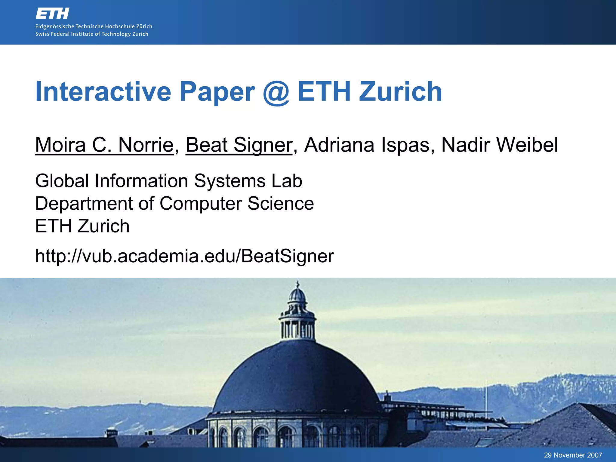 The document discusses the development and applications of interactive paper technology, specifically digital pen and paper systems created by Anoto, and their implementation in various settings. It highlights the EdFest project and its architecture for content publishing, including cross-media link infrastructure and active areas. The authors note the emergence of commercial products and the potential challenges and future developments in this technology.