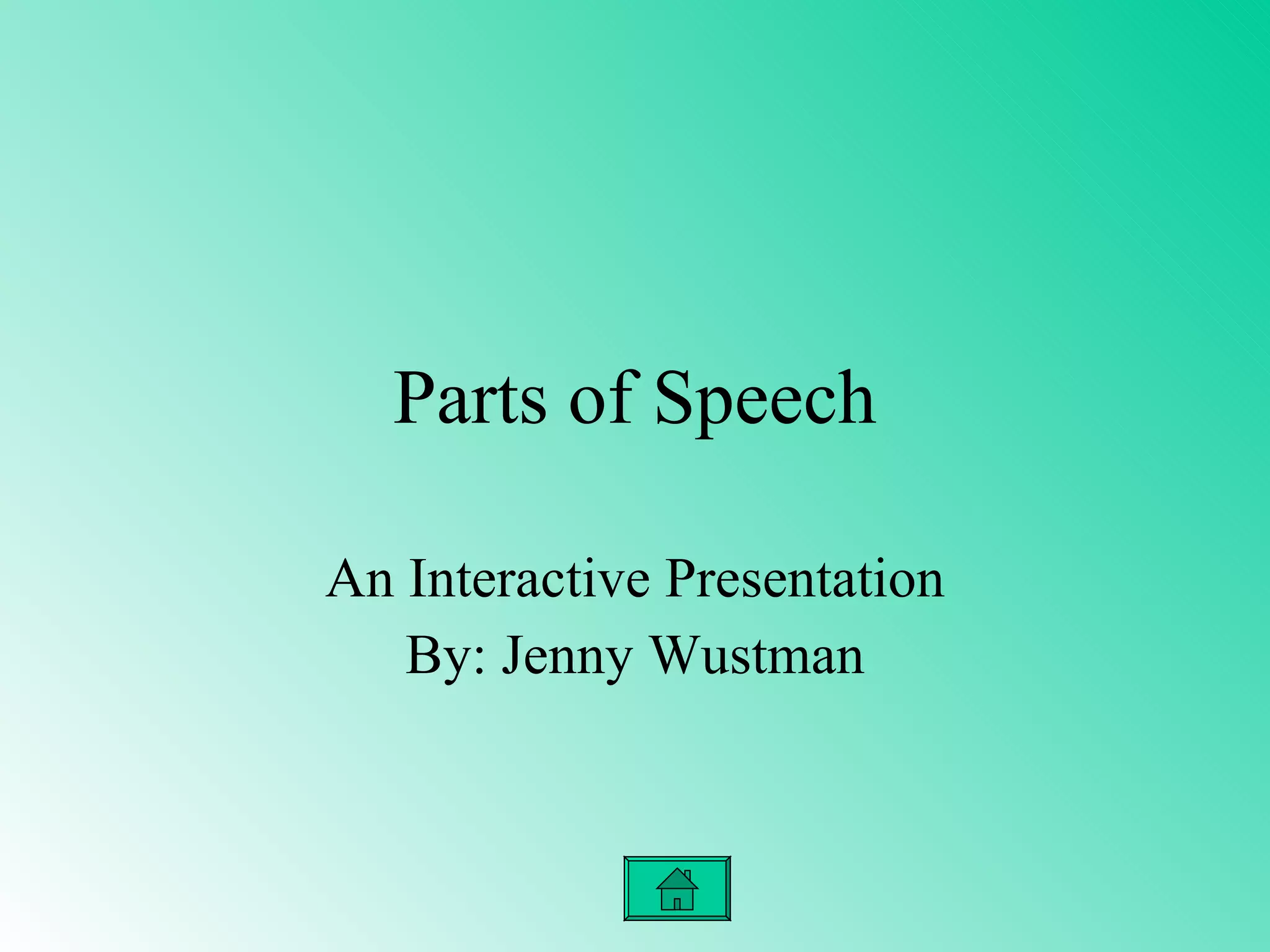 This interactive presentation defines and provides examples of different parts of speech, including nouns, pronouns, verbs, adjectives, and adverbs. It discusses various types of nouns like abstract, concrete, proper, common, collective, and compound nouns. It also covers different types of pronouns, verbs, adjectives, and adverbs. The presentation was created by Jenny Wustman, an English major who intends to become an elementary school teacher, and includes links to YouTube videos about parts of speech.