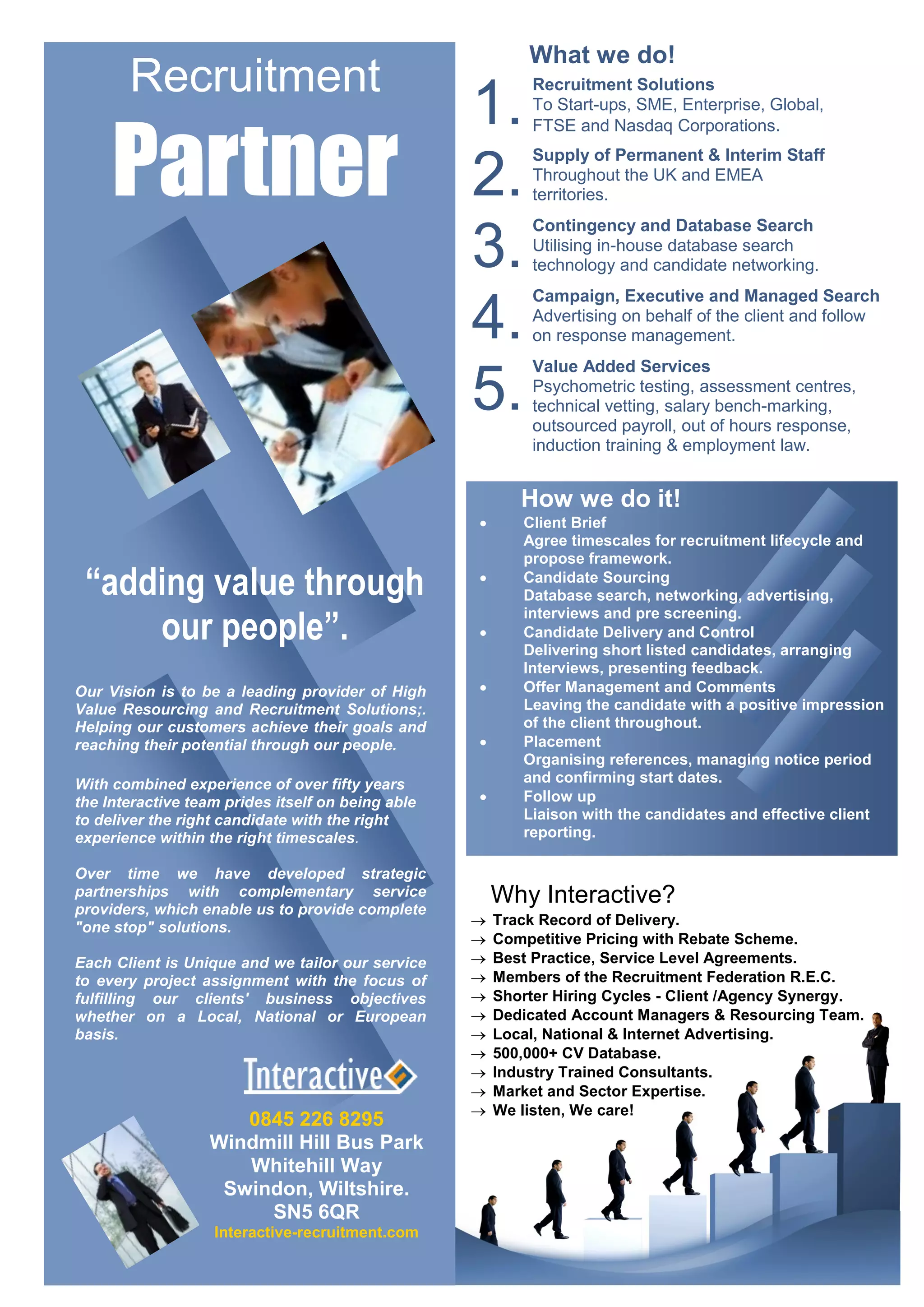 The document outlines the recruitment services provided by Interactive Recruitment, including permanent and interim staffing, contingency search utilizing their candidate database, executive search, and value-added services like testing and training. They aim to add value through their people by understanding client needs, sourcing candidates, delivering qualified options, managing offers, and following up for placement. With over 50 years of combined experience, their goal is to be a leading recruitment provider through dedicated teams, competitive pricing, and tailoring their service to each client's unique needs locally, nationally, or internationally.