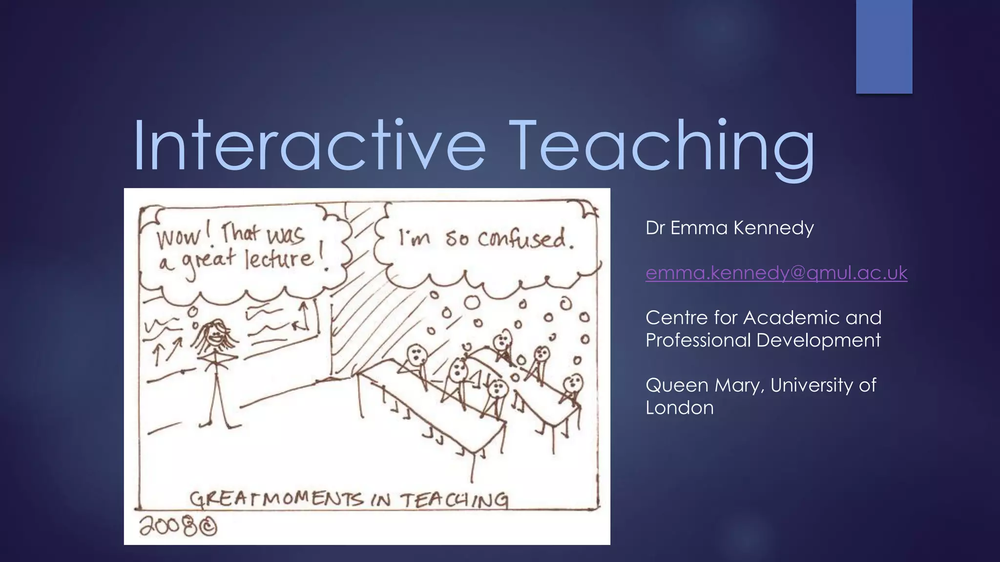 Interactive teaching emphasizes active learning, requiring student participation to enhance engagement and understanding. Evidence suggests that active learning strategies lead to improved student performance and positivity towards their learning experience, as well as helping teachers to connect with students more effectively. Effective techniques for increasing interaction include peer discussions, active questioning, and integrating technology into teaching practices.