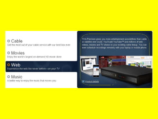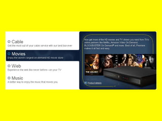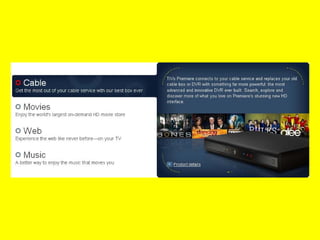 Interactive television, also known as iTV, allows viewers to interact with television content as they watch through a two-way communication between viewers and content providers using a set-top box connected to the TV. There are several forms of iTV including video-on-demand, allowing viewers to pause, rewind or fast forward live TV, influencing content by choosing plot details or endings, and tcommerce which allows purchases from the couch. iTV works through services like TiVo, mioTV and HubStation by StarHub which provide additional interactive features on top of traditional television viewing.