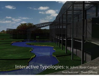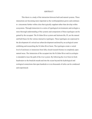 This document presents an abstract for a thesis about the interaction between built and natural systems. As populations grow and concentrate in cities, these interactions are becoming more important. The thesis will immerse occupants in a series of built typologies expressing different levels of integration with natural ecologies. The St. Johns River system and Jacksonville, FL will serve as the natural and built contexts. A mixed-use development anchored by an ecological center will exhibit and research the river basin through typologies ranging from closed research biomes to open natural areas. The goal is to condense and experience the hydrological and ecological connections of the river system from freshwater headwaters to the brackish mouth.
