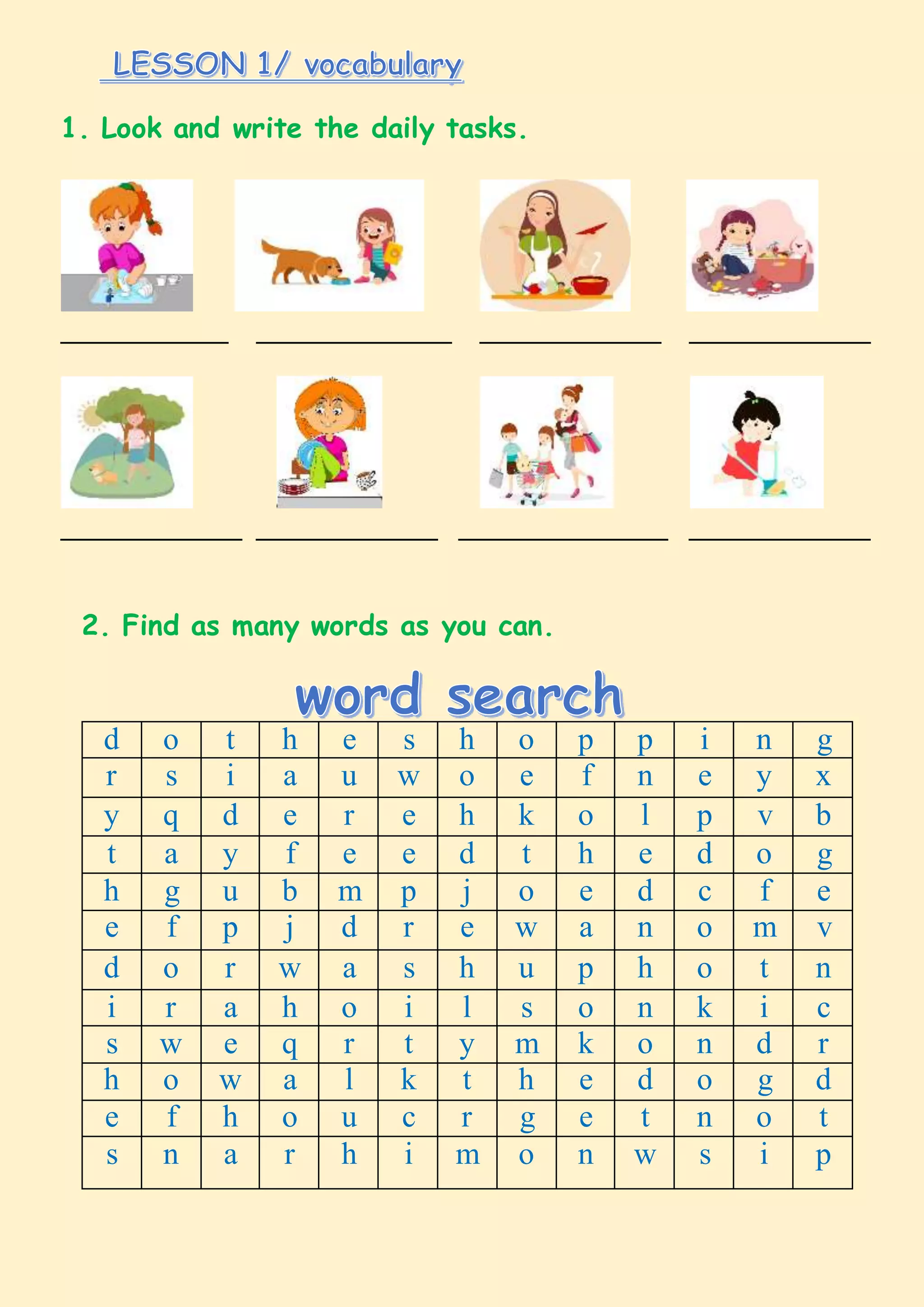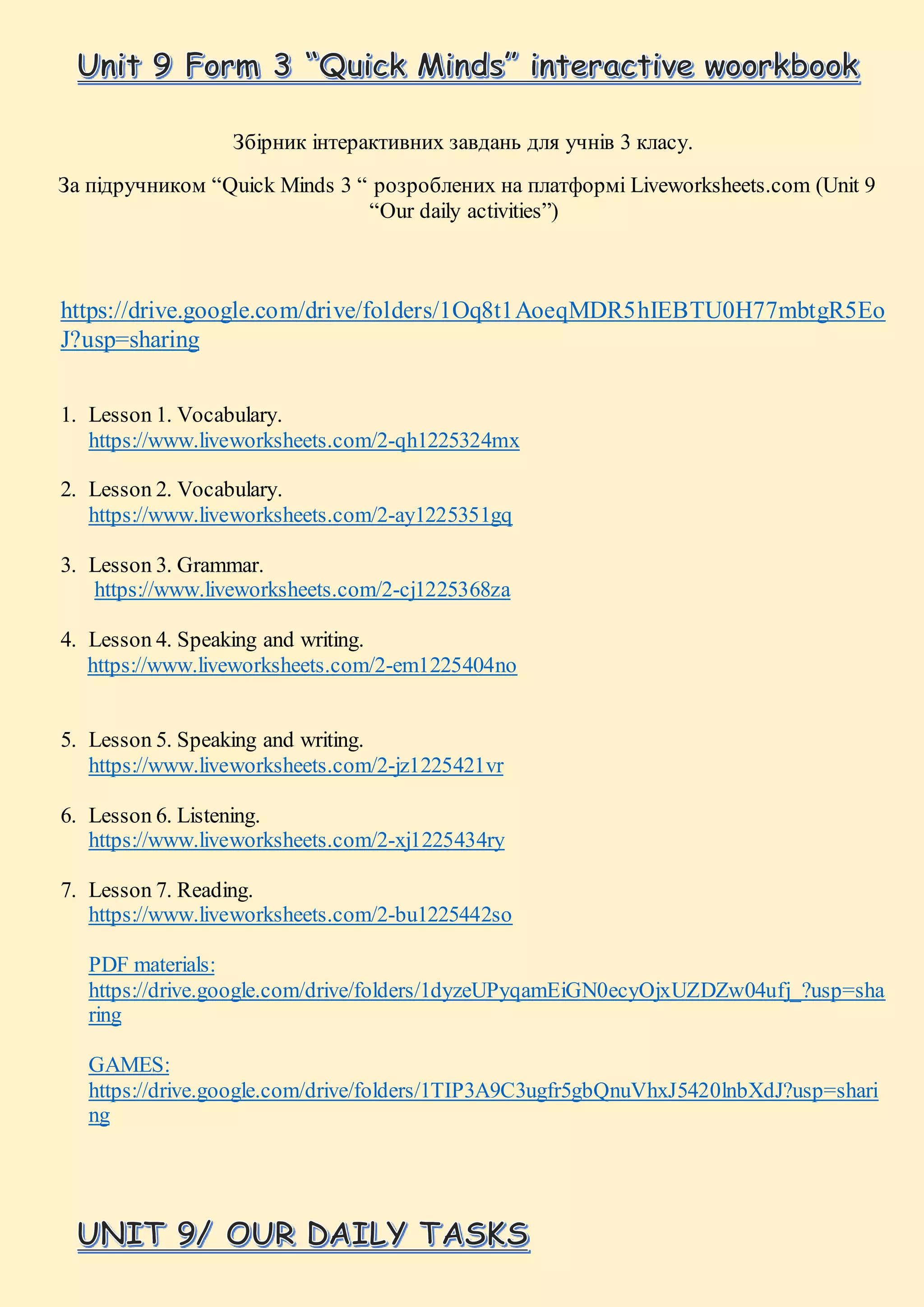 The document contains an interactive workbook for 3rd grade students based on the textbook "Quick Minds 3". It includes 7 vocabulary, grammar, speaking, writing and listening lessons and additional PDF materials and games. The lessons contain exercises like matching daily activities with sentences, finding hidden words, writing sentences about daily routines and playing a board game about time.