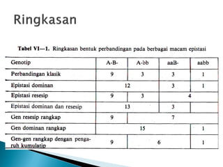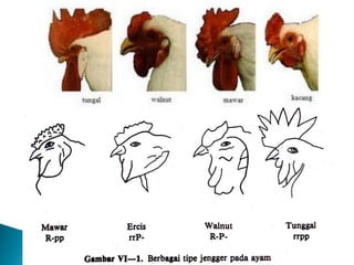 Dokumen membahas tentang epistasi dan hipostasi dalam pewarisan sifat. Epistasi terjadi ketika ekspresi suatu gen ditutupi oleh gen lain yang bukan alelnya. Hal ini dapat dilihat pada pewarisan bentuk jengger ayam yang melibatkan dua pasang gen.