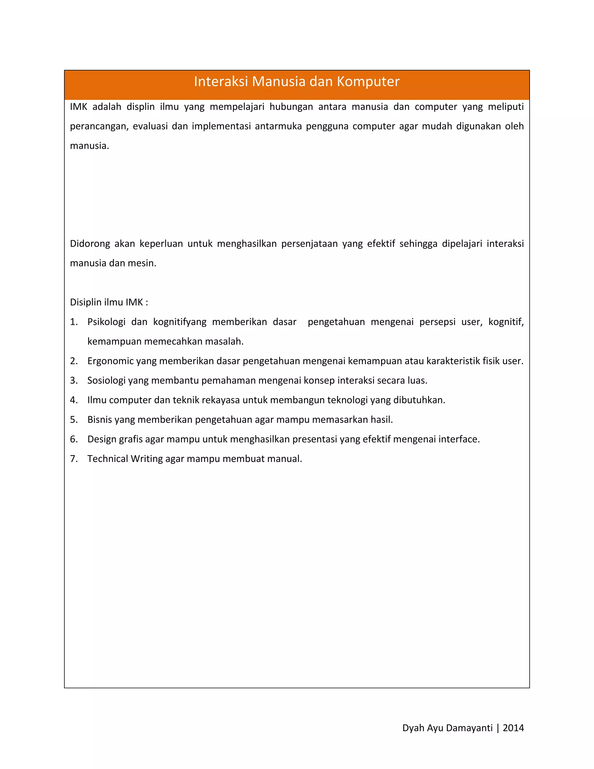 Dokumen ini membahas interaksi manusia dan komputer (IMK) sebagai disiplin ilmu yang mempelajari hubungan antara pengguna dan komputer, termasuk perancangan dan evaluasi antarmuka pengguna. Berbagai prinsip dan aspek seperti usability, proses informasi, serta ergonomi juga dijelaskan untuk meningkatkan desain antarmuka dan pengalaman pengguna. Penekanan pada pentingnya memahami karakteristik pengguna dan pengembangan prototipe untuk memenuhi kebutuhan sistem menjadi sorotan utama.