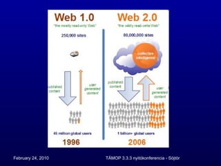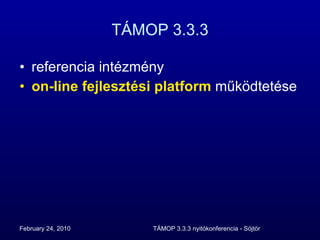 Fejlesztési platform Interaktívközösségi portál a közös fejlesztés segítésére cikkek hírek szakmai blogok (mikrocsoportok) események képgalériák e-portfólió - i-portfólió nagy hálózatok összekapcsolása OOIH Educatio TÁMOP 3.2.2 intézményi honlapok i-portfóliól megjelenítése egyedi lehetőségek ismertetése