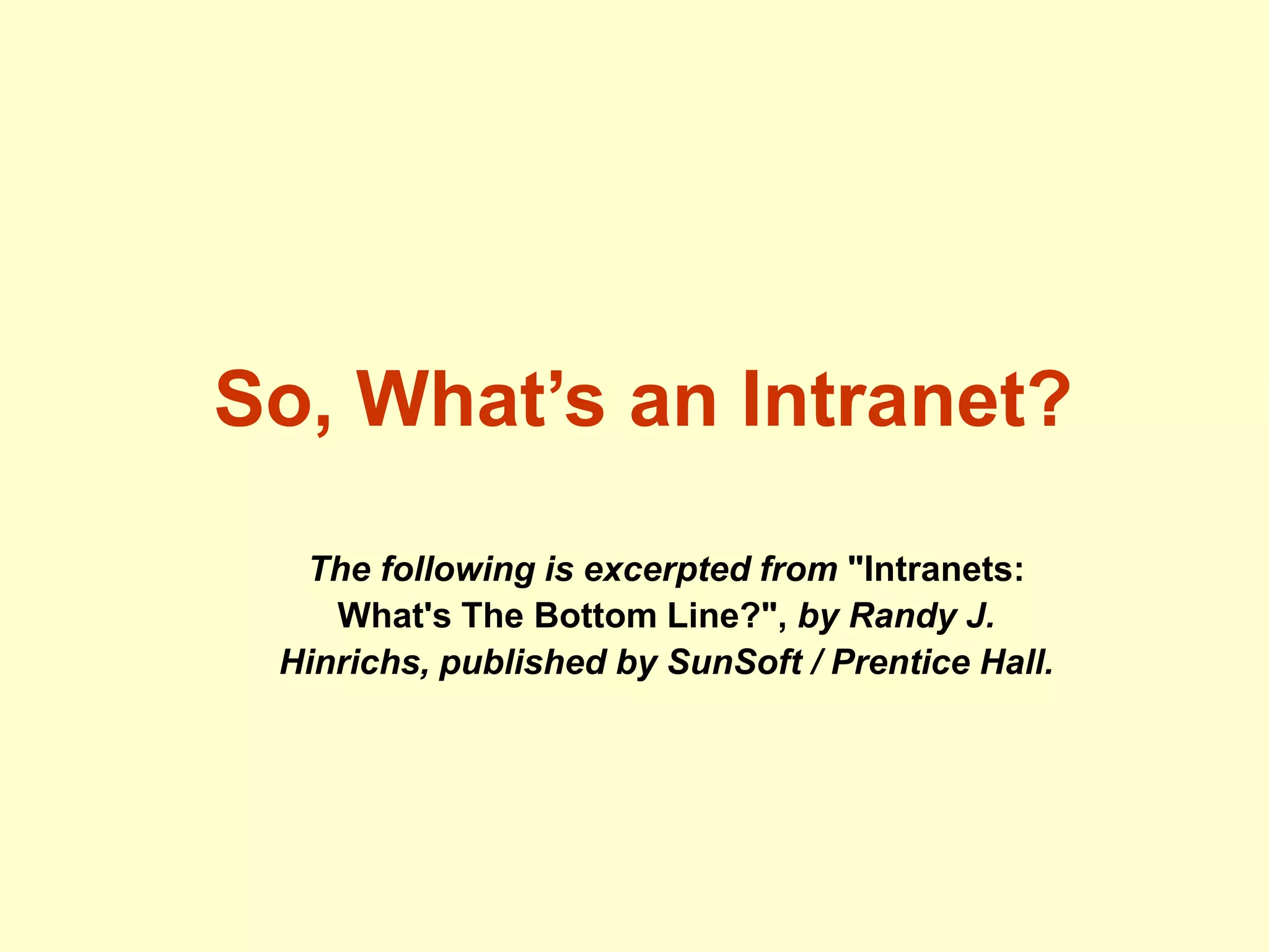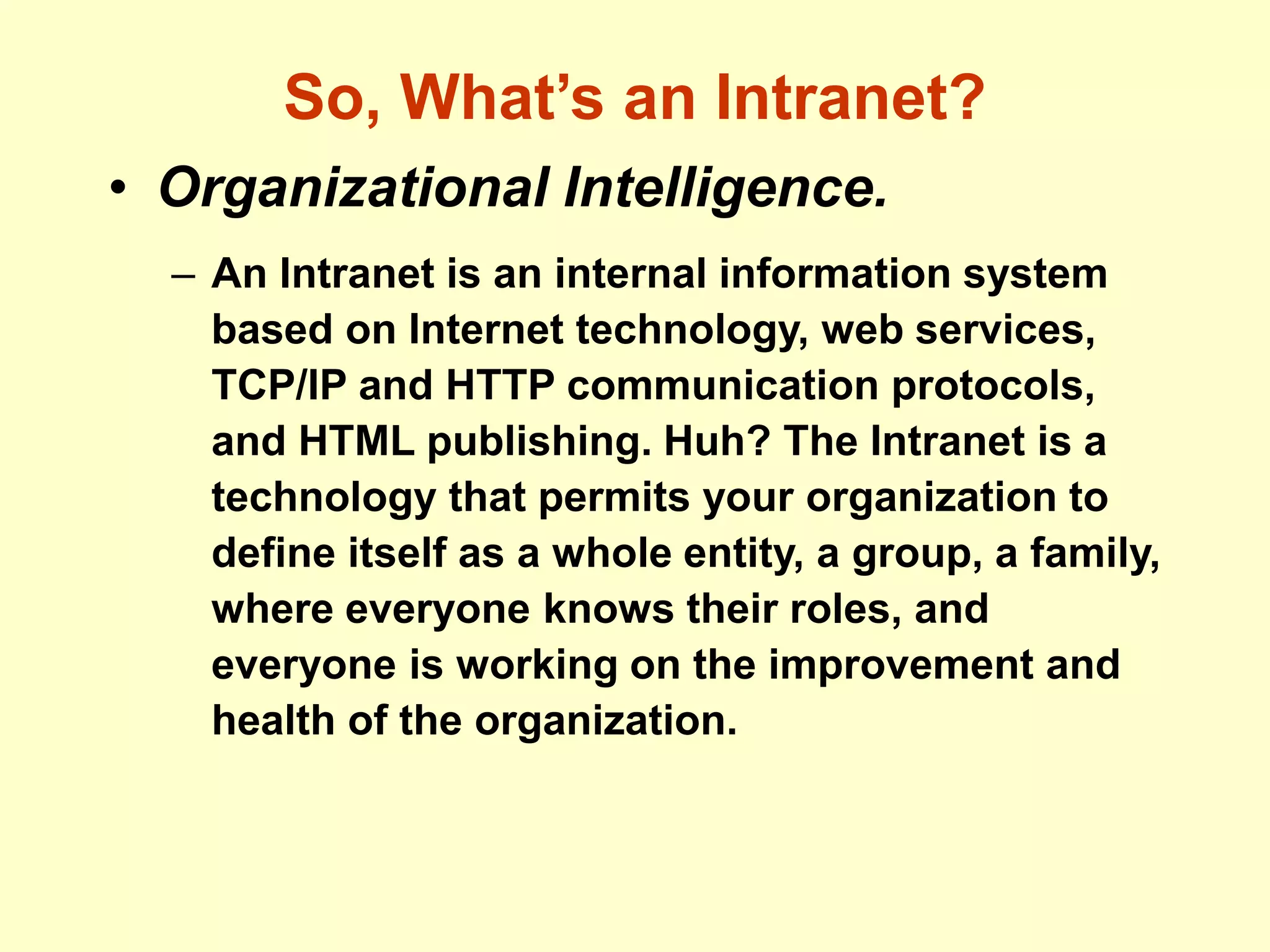 The document discusses what an intranet is and is not. It defines an intranet as an internal information system based on internet technology that allows an organization to communicate missions, goals, projects, and culture online in a single interface. An intranet represents an organization's "intelligence". The document provides examples of how intranets can be used as a decision making tool, communication tool, collaboration tool, and process improvement tool. It also describes what intranets are not, such as the internet, a LAN/WAN, or groupware.