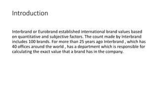 Interbrand is a brand valuation firm that publishes an annual ranking of the top 100 global brands. It values brands based on both quantitative and subjective factors like financial performance, marketing investment, and brand strength. Interbrand's methodology for valuing brands was the first to be ISO certified. It examines the financial performance generated by branded products/services, the influence of brands on consumer choice, and the premium and revenue brands command. Brand value goes beyond products/services and assets to intangibly generate value for a company.