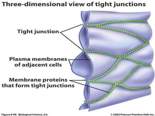 There are three main types of intercellular junctions: gap junctions, tight junctions, and anchoring junctions. Gap junctions allow communication between cells through channels that connect adjacent cell membranes. Tight junctions form a continuous seal around cells to prevent fluid leakage between them. Anchoring junctions attach cells to each other and to extracellular matrices through proteins like cadherins, integrins, and intermediate filaments. The three types of anchoring junctions are desmosomes, hemidesmosomes, and adherens junctions.