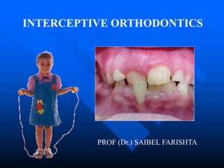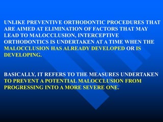 This document discusses interceptive orthodontics, which aims to prevent potential malocclusions from progressing into more severe ones. Key procedures discussed include serial extraction, correction of developing crossbites, controlling abnormal habits, regaining space after premature tooth loss, closing diastemas, muscle exercises, intercepting skeletal malrelations, and removing soft tissue or bony barriers inhibiting tooth eruption. Serial extraction involves the planned extraction of certain teeth to guide others into favorable positions. Developing anterior crossbites should be corrected early to prevent skeletal malocclusions. Interceptive orthodontics recognizes and eliminates irregularities and malpositions early to guide proper development.