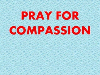 This document discusses the importance of praying for and showing compassion. It provides several Bible verses explaining that God is compassionate and calls believers to show mercy to others. The document also discusses how Jesus showed compassion to the blind men and sick. It provides the example of Mother Theresa advocating for treating all people, especially the poor and outcasts, with dignity and compassion. The conclusion discusses the Parable of the Prodigal Son and the father showing compassion to his returning son.