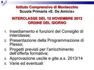 Il documento descrive l'organizzazione e le attività del consiglio di interclasse della scuola primaria 'E. De Amicis' di Montecchio, delineando le sue funzioni e composizione. Viene presentata la programmazione didattica e i progetti educativi per l'anno scolastico 2013/2014, inclusi progetti ambientali, attività extrascolastiche e iniziative di promozione della lettura. Sono inoltre menzionate le relazioni con le scuole dell'infanzia e secondaria, evidenziando i protocolli di continuità e le collaborazioni per un curricolo unitario.