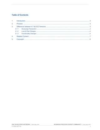The document discusses the differences between intercompany reconciliation in SAP ECC versions compared to SAP R/3 version 4.7. It notes that in ECC versions, intercompany reconciliation is a multi-step process compared to the single step process in 4.7. It also outlines the different transaction codes used to access intercompany reconciliation in the two systems and highlights changes to the screens and additional functionality available in ECC versions.
