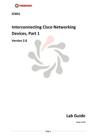 This document provides lab guides for the Cisco CCNA ICND1 certification. It includes visual topology diagrams and command lists for various labs covering topics such as initial switch and router configuration, security, VLANs, routing protocols and IPv6. The first lab guide provided involves initial configuration of a switch, including defining a hostname, enabling an IP address, and troubleshooting connectivity issues. The second lab guide covers initial router configuration including inspection of hardware/software, defining a hostname and interface IP address. Subsequent labs cover security, routing, and IPv6 configuration.