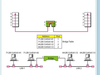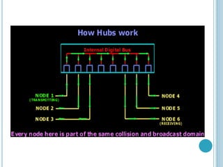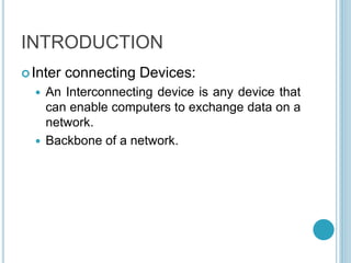 Interconnecting devices allow computers to exchange data on a network and form the backbone of a network. Common interconnecting devices include hubs, repeaters, bridges, switches, routers, and gateways. Hubs operate at the physical layer and replicate and broadcast all data to all ports. Repeaters extend network distance by regenerating weak signals. Bridges operate at the data link layer and filter traffic between connected segments. Switches learn MAC addresses and filter traffic at the data link layer. Routers filter at the network layer using IP addresses and can connect different network types. Gateways connect heterogeneous networks using protocol translation at all seven OSI layers.