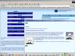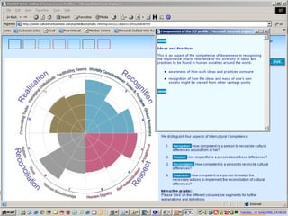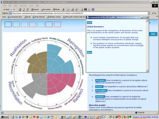 The document describes the Intercultural Competence Assessment and Development Process (ICAD) which is a service that assesses and enhances the intercultural skills of leaders. It includes online assessments, workshops, follow up development, and coaching. The process uses the Intercultural Competence Profiler (ICP) which is an online assessment tool that measures four aspects of intercultural competence: recognition of differences, respect, reconciliation, and realization. The ICP provides personalized profiles and feedback to help individuals improve their intercultural skills.
