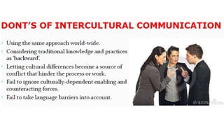 This document discusses intercultural communication. It defines intercultural communication as communication between two or more people from different cultures. It explains that studying intercultural communication is important due to increasing globalization, diversity in workplaces, and the need for ethical business leaders. The document also discusses cultural differences in verbal and nonverbal communication. It provides steps for effective intercultural communication, such as developing cultural awareness and not stereotyping. Finally, it discusses characteristics of competent intercultural communicators and Bennett's Developmental Model of Intercultural Sensitivity.