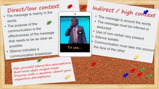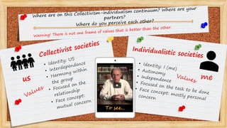 This document discusses how culture impacts communication styles, specifically looking at the dimension of collectivism vs individualism. It explains that more collectivist societies tend to use more indirect communication styles that protect relationships and rely more on context than direct words. Individualistic societies tend toward more direct communication that is less contextual and relies more on explicit words. It provides examples of how this dimension influences whether a culture has high-context or low-context communication styles.