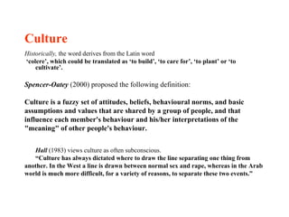 This document discusses definitions and dimensions of culture from various scholars. It defines culture as shared attitudes, beliefs and values that influence behavior within a group. Key dimensions identified include individualism vs collectivism, power distance, masculinity vs femininity, and long-term orientation. Examples are given of how these dimensions differ across cultures like the US, Western Europe, China, and Japan.