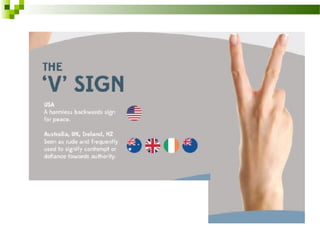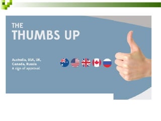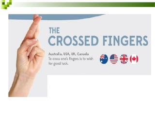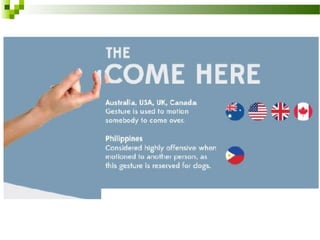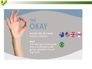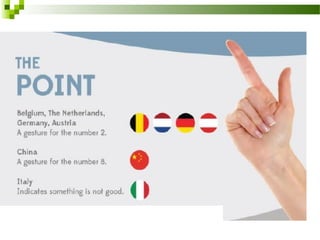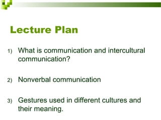 This document discusses intercultural communication and body language. It begins with definitions of communication and intercultural communication, which focuses on differences in language and behavior patterns between cultures. It then outlines four areas of nonverbal communication studied: proxemics (personal space), haptics (touch), oculesics (eye contact), and kinesics (body language). Specific gestures and their meanings are then examined, including variations between cultures for areas like eye contact, hand gestures, and bowing. Intercultural nonverbal communication can impact understanding if not properly interpreted between cultures.
