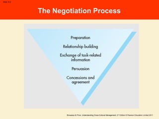 The document discusses intercultural negotiation. It notes that international negotiation is more complex than domestic negotiation due to differences in national cultures and political/economic systems. The negotiation process involves preparation, relationship building, exchanging information, persuasion, and reaching concessions or agreements. Tactics like promises and threats can be used. Cultural differences exist in negotiation styles between countries like the US, Brazil and Japan. Successful intercultural negotiation requires understanding these differences and preparing appropriately.