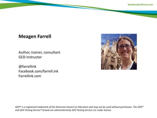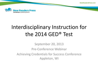 The document discusses the importance of interdisciplinary instruction for GED test preparation, comparing it to training for a marathon as opposed to solitary exercise. It highlights strategies for integrating multiple subjects to keep learning engaging and effective, particularly in relation to the 2014 GED test content. It also encourages reflection and discussion among educators about implementing these instructional methods.