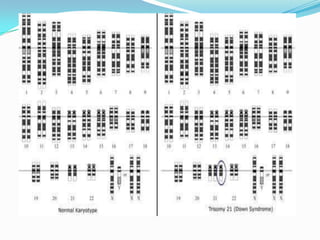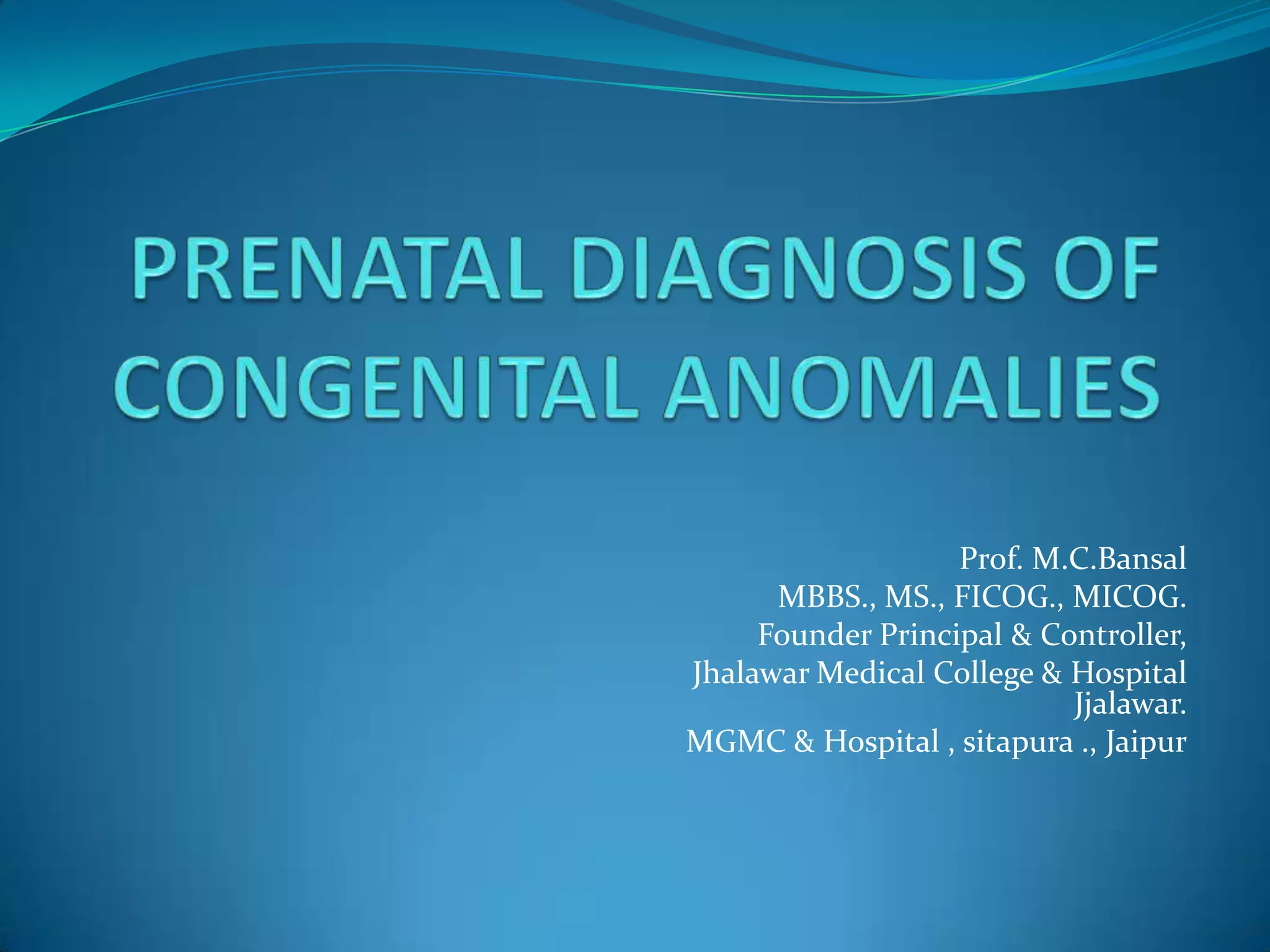 Prenatal diagnosis employs techniques like amniocentesis and chorionic villus sampling to determine the health of the unborn fetus. It is helpful for managing the pregnancy, determining outcomes, and planning for complications. It allows decisions about continuing the pregnancy and identifying conditions that could affect future pregnancies. Maternal serum screening measures markers like alpha-fetoprotein to screen for neural tube defects and other abnormalities by detecting higher than normal levels that cross the placenta.