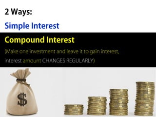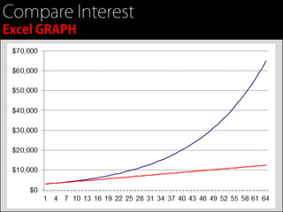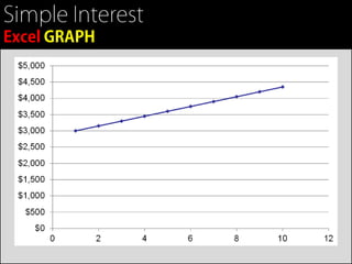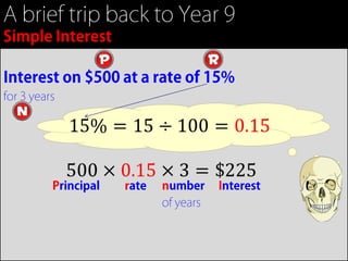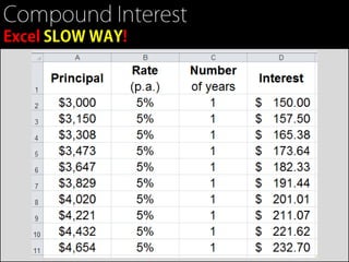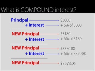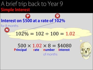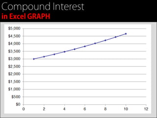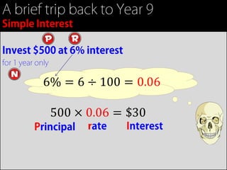 It also shows calculations with compound interest over time, such as multiplying a starting amount by rates raised to various powers to calculate interest accumulated over different periods of time.