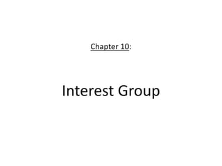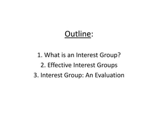This document provides an outline and details of Chapter 10 on Interest Groups. It discusses what interest groups are, characteristics of effective interest groups, and an evaluation of interest groups. Interest groups represent various segments of society and try to influence government policy outside of elections. Effective interest groups have significant money, membership, access to lawmakers, and focus on single issues. While interest groups are part of democracy, they may disproportionately represent well-organized, wealthy interests over public interests and smaller, less powerful groups.