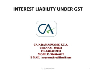 The document discusses interest liability under the GST Act. Section 50 deals with interest payable for delayed tax payments. Per the section and various court judgments, interest is typically levied on the net tax amount owed after considering available input tax credits. However, a recent Telangana High Court judgment dismissed a writ petition and held that interest should be calculated on the full gross tax liability until returns are filed to claim credits. Stakeholders now face uncertainty as amendments aligning the law with the intent of compensating the government for delayed net amounts have not been enacted.