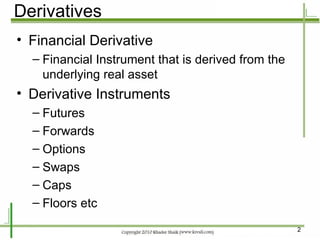 This document discusses interest rate derivatives, which are financial instruments derived from underlying interest rates or cash markets. Some popular types of interest rate derivatives are futures, forwards, options, and swaps. Interest rate derivatives allow investors to adjust portfolio positions more quickly and cheaply than transacting in the underlying instruments. They also provide more liquidity. Specifically, the document defines interest rate futures, swaps, caps, and floors, and discusses the markets for exchange-traded versus over-the-counter interest rate derivatives.