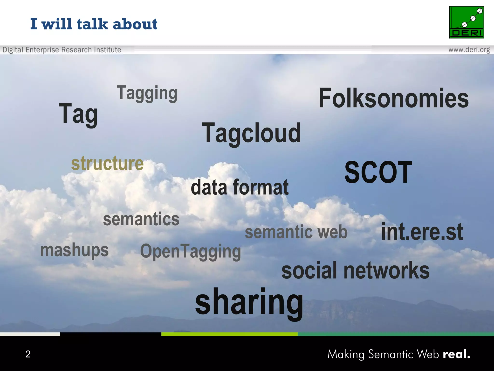 This document discusses the need for sharing tags across different systems and platforms. It proposes using SCOT (Social Semantic Cloud of Tags), an ontology for representing tagging data, and the OpenTagging platform for enabling interoperability among tags from different sources. The OpenTagging platform uses SCOT's data model and provides APIs to retrieve, search, and integrate tagging data from various social tagging applications and services in a unified manner. This allows tags to be portable and shared across different users, communities and sources.