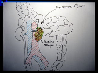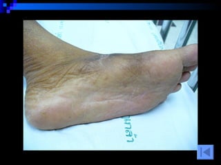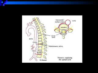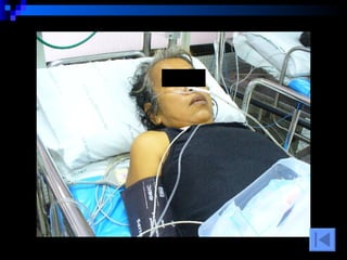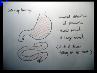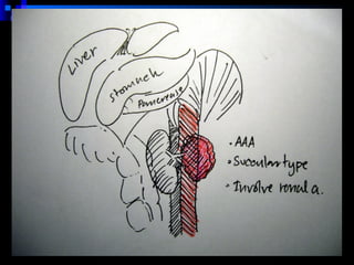 Interesting case 1. 2. INTERESTING CASE ผู้ป่วยหญิงไทย อายุ 52 ปี CC : ขาอ่อนแรงสองข้าง 2 ชั่วโมงก่อนมารพ . PI : 2 ชั่วโมงก่อนมารพ . หลังตื่นนอนตอนเช้า มีอาการชาขา ขยับขาไม่ได้ ลุกไม่ขึ้น ไม่เจ็บอก ปวดหน่วงท้องน้อย ร้าวไปขา ปวดหลัง ต่อมา 1 ชั่วโมง ผู้ป่วยมีอาการอาเจียนเป็นเลือดสด 1 ครั้ง ประมาณครึ่งแก้ว ( 50 cc ) ไม่มีถ่ายดำ ไม่มีถ่ายเป็นเลือด ไม่หน้ามืด 3. PAST HISTORY Underlying HT poor control Underlying โรคกระเพาะอาหาร เป็นๆหายๆ ทานยาหม้อเป็นประจำเนื่องจากปวดหลังบ่อยๆ ดื่มสุราวันละ 1 แก้ว หยุดมา 3 เดือน สูบบุหรี่วันละ 1 ซอง หยุดมา 3 เดือน 4. 5. Physical examination V/S BT 36.5 PR 150 RR 20 BP 190/120 Moderate pale , no icteric sclera Lung : clear Heart : tachycardia ,regular ,no murmur Abdomen : ill-defined mass at epigastrium , voluntary guarding , rebound –ve No sign chronic liver disease 6. 7. Abdomen : expanding pulsatile mass , size10cm at epigastrium , bruit&thrill +ve Affected part 8. Neurological examination DTR clonus Cranial nerve : normal Pupil 3 mm RTL BE Motor V V III III BBK Sensory Decrease pinprick & temp sensation below L1 level 9. 10. Pulse Pulse examination Rt Lf Carotid 2+ 2+ Radial 2+ 2+ Femoral 0+ 0+ Popliteal 0+ 0+ Posterior tibial 0+ 0+ Dorsalispedis 0+ 0+ Cyanosis of distal toes & cold skin 11. 12. 13. 14. 15. 16. Problem list Acute paraparesis Acute limb ischemia UGIH Abdominal pulsatile mass Malignant HT Underlying PU 17. 18. 19. 20. Appraoch weakness UMNL อ่อนแรงเป็นกลุ่มๆ , ครึ่งซีก หรืออาจ 2 ข้างก็ได้ hypertonia, spasticity DTR ไว BBK, clonus + No fasciculation LMNL อ่อนแรงเฉพาะมัด หรือเป็นกลุ่ม Hypotonia or flaccid DTR – BBK, clonus – Fasciculation 21. UMNL weakness ถ้ามี cranial nerve involvement ให้ดูว่า cranial involve ข้างเดียวกันหรือคนละข้างกับแขนขาที่ weak ถ้าคนละข้าง brainstem , ถ้าข้างเดียวกัน อาจเป็นได้ทั้ง cortex และ subcortex ถ้าไม่มี cranial involvement และมี sensory loss เป็น level spinal cord lesion 22. Spinal cord lesion : causes Acute Vascular : dissection , emboli Rupture AVM Trauma Subacute/chronic Infection : staph, fungus , TB Tumor HNP Vasculitis 23. 24. Anterior spinal cord ischemia Radicular pain at onset Sudden paraplegia Flaccid spastic Areflexia hyperreflexia and extensor plantar response Loss pain , temp Preserved vibration & joint position Bowel & bladder symptoms 25. 26. 27. Management Airway : หายใจได้เอง , no airway obstruction Breathing : หายใจเร็วเล็กน้อย , O2 sat 99% (O2 canula 3 LPM) , equal BS Circulation : severe HT At 10.30 BP 262/155 , PR 131 , RR 24 Propanolol (40) 1 tab oral stat Then NTG (1:10) 5 ud/min 10 ud/min 28. Management NPO , retained NG tube 0.9% NaCl 1000 ml iv KVO x 2 เส้น omeprazole 40 mg iv q 12 hr G/M PRC 6 unit Monitor EKG BP q ½ hr Hct q 4 hr 29. 30. CBC 7.8 23.7 24,600 N=70 L=25 280,000 Coag : PT 12.7 (ratio 1.08 ) Ptt 25.1 (RATIO 0.84 ) Tt 6.3 ( RATIO 0.9) 31. 32. LFT TB/DB = 0.2/0.1 AST/ALT = 16/12 ALP 100 A/G = 3.1/4.0 33. 34. U/S abdomen No free fluid AAA 5 cm Can’t seen intimal flap 35. 36. 37. 38. 39. 40. 41. 42. 43. 44. CT SCAN AAA juxtrareal -> bifurcation Size 10*8*4 cm Inflamatory tissue around AAA Intact renal artery Aortic dissection at juxtra renal -> bifurcation Bowel wall thickening at 3 rd -4 th part of duodenum 45. Progress note 09.30 : BP 190/110 , PR 150/min 10.00 : BP 200/120 , PR 136/min 10.30 : BP 262/155 , PR 131/min Start propanolol 40 mg oral & NTG drip Consult med , consult surg 13.45 : BP 126/93 , PR 130 (NTG35ud/min ) 15.30 : CT abdomen with contrast 46. Progress note 15.45 : consult surg ให้ความเห็นว่า น่าจะเป็น chronic dissecting aneurysm ของเก่าอยู่แล้ว ส่วนเรื่อง limb คิดว่าเป็น chronic arterial occlusion ให้ med ดูต่อ และถ้า stable ให้ทำ MRI 16.00 : cardio med : นึกถึง hypertensive emergency with dissecting aneurysm ให้ drip NTG ต่อ และ continue b-blocker 47. 15/02/50 BP 110/70-140/80 (NTG 60 ud/min , herbessor (1:60) 30 ud/min ) PR 80/min Urine 2 ml/kg/hr Cr 0.4 Hct 27 (PRC 2 unit) , no active bleeding 48. 16/02/50 BP 130/80 , PR 70 , RR 18 Hct 31 , no active bleeding Consult surg อีกครั้ง เรื่อง dissecting aneurysm ศัลยกรรมตอนแรก plan ผ่าตัด แต่ต่อมาขอเลื่อน เนื่องจากต้องการรอผล aortogram , CT chest ก่อน 49. 50. 23/02/50 ระหว่างรอทำ CT angiogram ผู้ป่วยอาเจียนเป็นเลือดจำนวนมาก 1 กระโถน BP drop 50/30 , PR 130 ETT , load iv , G/M BP 70/50 หลังได้ iv ~ 5000 ml Set OR emergency 51. 52. 53. 54. 55. 56. 57. 58. Dissecting involve descending aorta splanchnic ischemia R