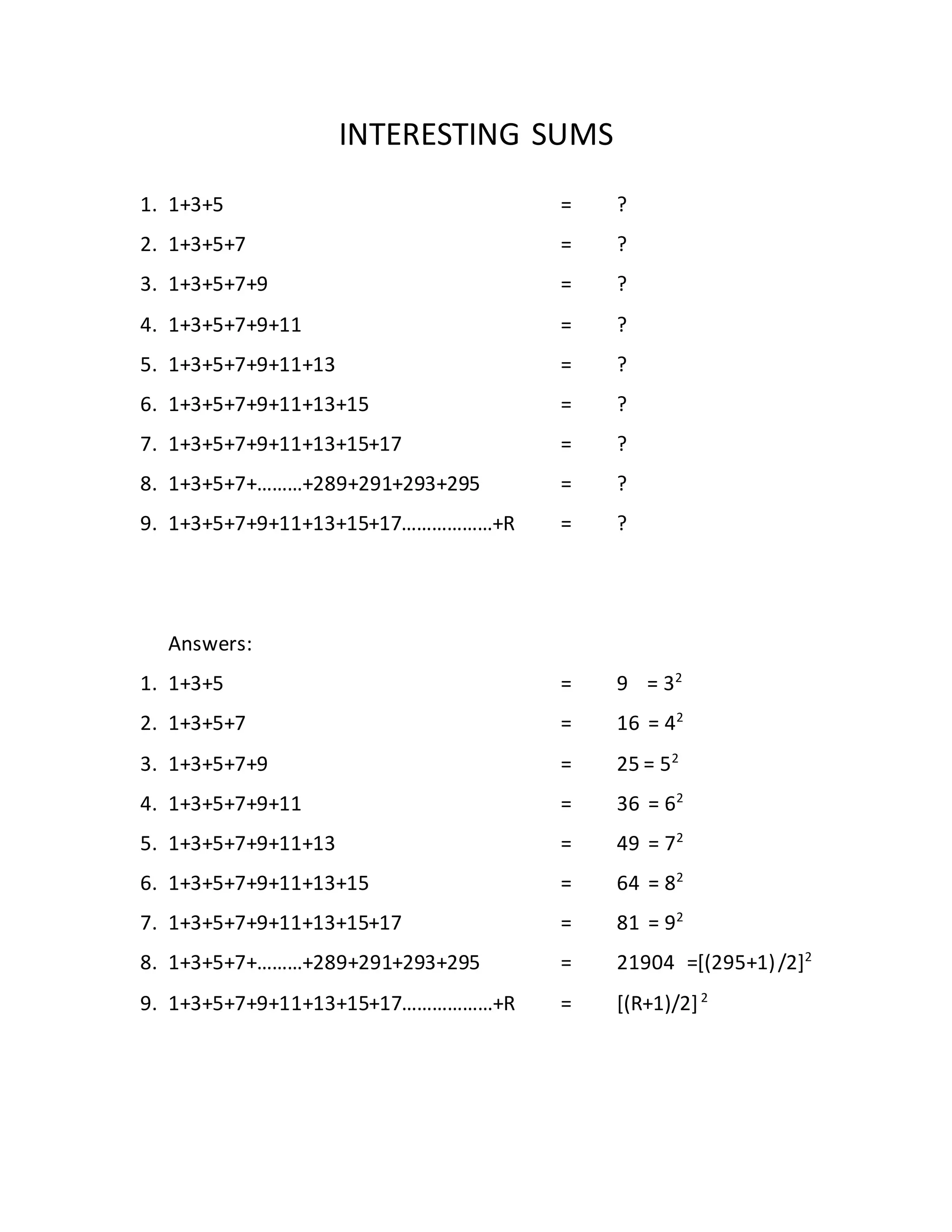 9. 1+3+5+7+9+11+13+15+17………………+R = [(R+1)/2] 2
