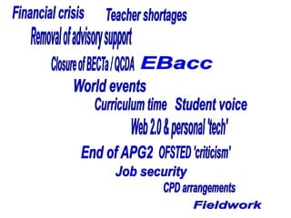 This document discusses issues related to geography education in the UK. It notes that geography is facing interesting times due to the national curriculum review and OFSTED reports finding declining geography teaching in many schools. The document provides information on the curriculum review timeline and process. It also discusses debates around what constitutes knowledge, the importance of both factual and conceptual knowledge, and practical classroom activities.