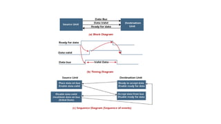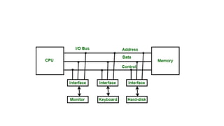 3. I/O interfaces contain registers to buffer input and output data and status information during transfers between CPUs and peripheral devices like keyboards, printers, and monitors.