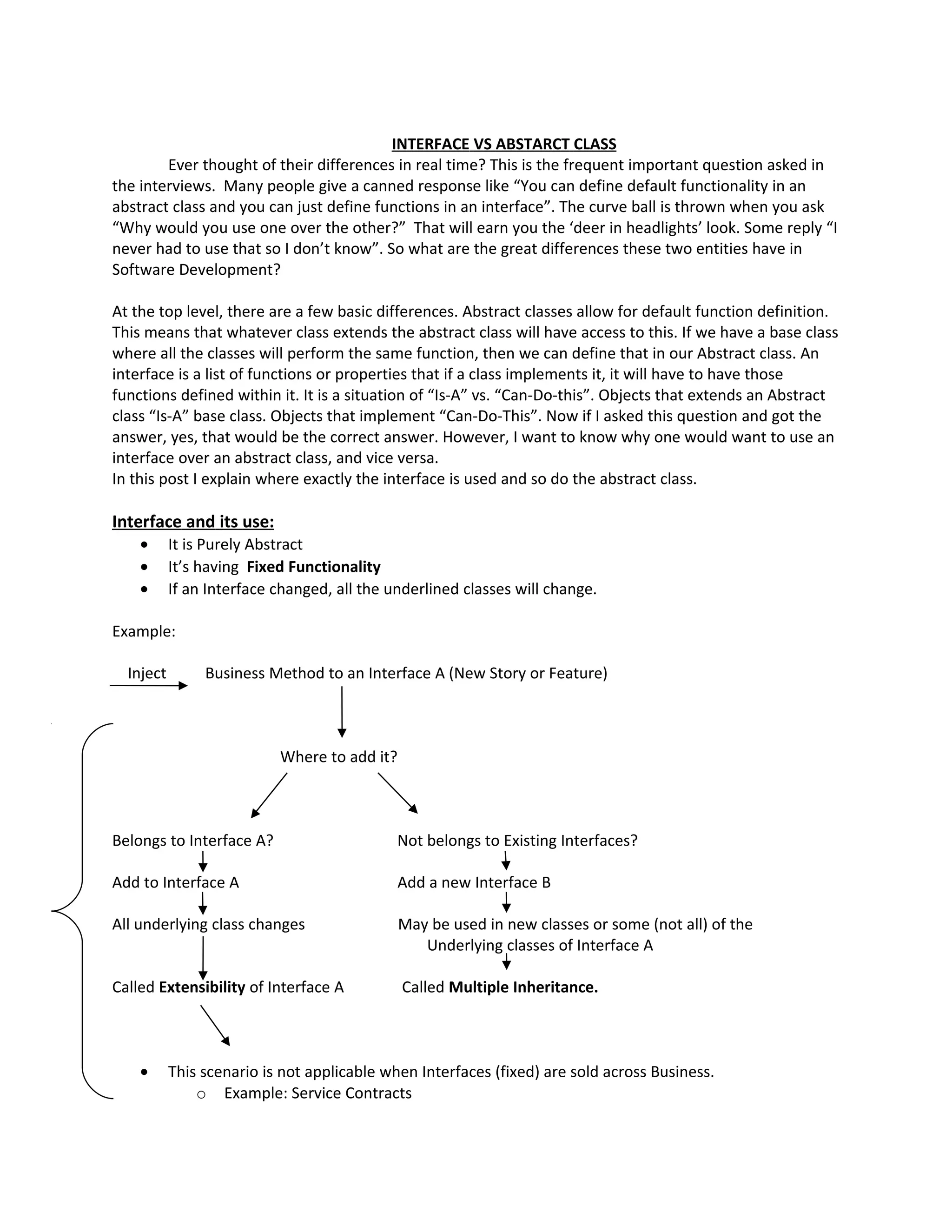 This document discusses the differences between interfaces and abstract classes in software development. It explains that interfaces define a contract that implementing classes must follow, while abstract classes can provide default functionality for subclasses. The key differences are that interfaces cannot contain method implementations, but abstract classes can, and changing an interface can break implementing classes, while extending an abstract class allows inheriting new functionality. It provides examples of when each would be preferable, such as using interfaces for unrelated classes and abstract classes for closely related subclasses that share common behavior.