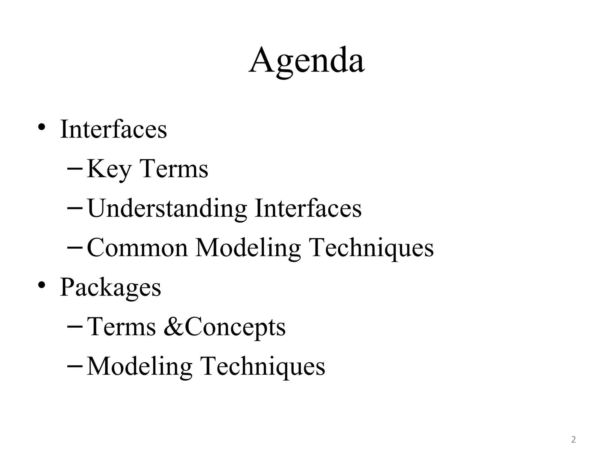 Interfaces allow for separation of concerns and evolution of a system over time without disrupting existing structures. They specify a service that a class or component provides without implementing any structure or behavior. Common modeling techniques for interfaces include identifying seams between components, modeling static and dynamic types, using packages to group logically related elements, and creating architectural views to visualize different aspects of a system.