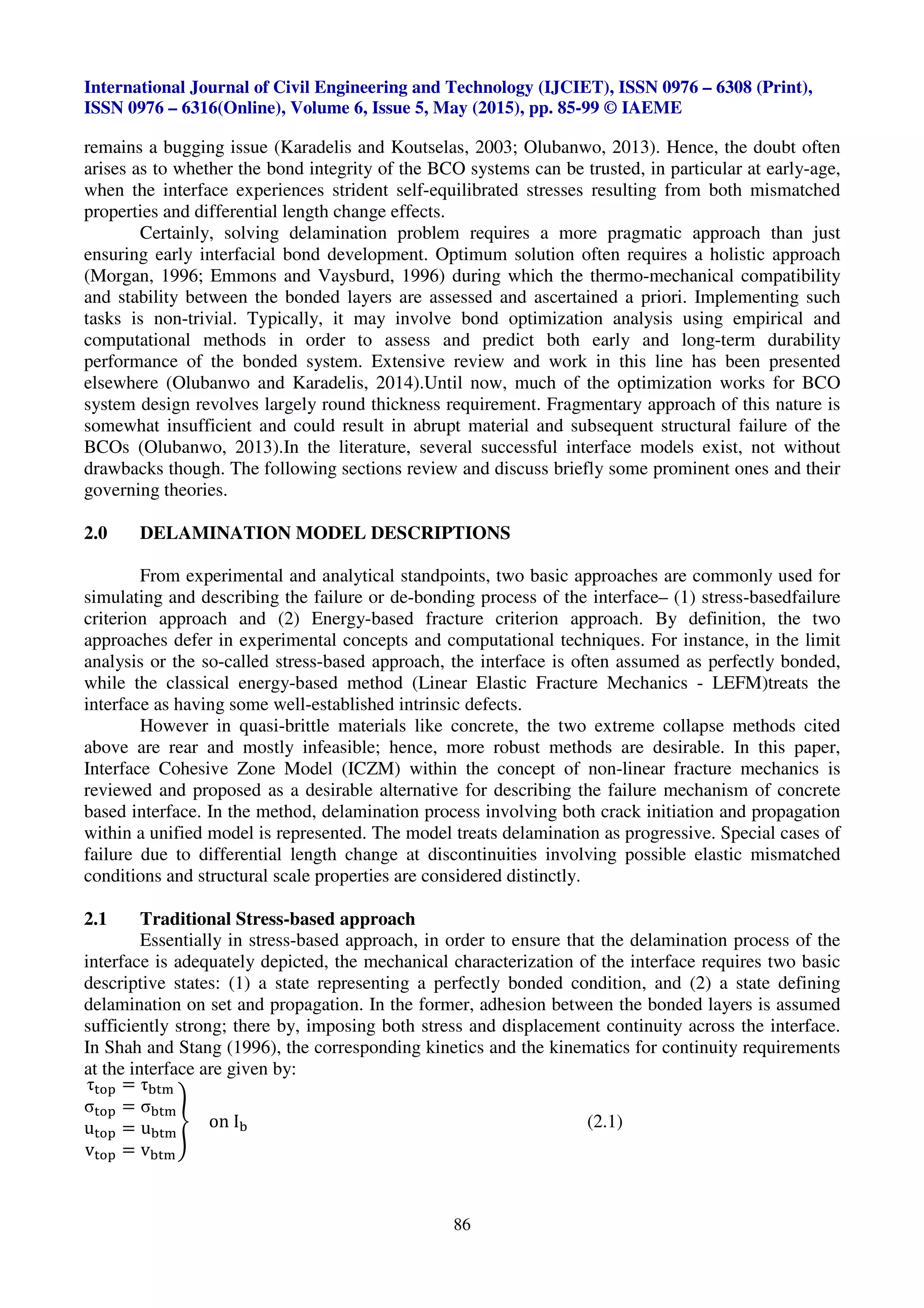 This document reviews theories and modeling methods for describing delamination failure at the interface between two bonded cementitious materials. It discusses traditional stress-based and energy-based failure criteria approaches. It presents the interface cohesive zone model (ICZM) as a viable approach for describing and predicting delamination in bonded concrete overlay systems. The ICZM treats delamination as a progressive failure involving both crack initiation and propagation. It considers distinct analytical cases involving material and structural property variables. The concluding model shows that numerical values of delamination coefficients and energy release rates vary depending on overlay scale, problem type, and material property mismatches.