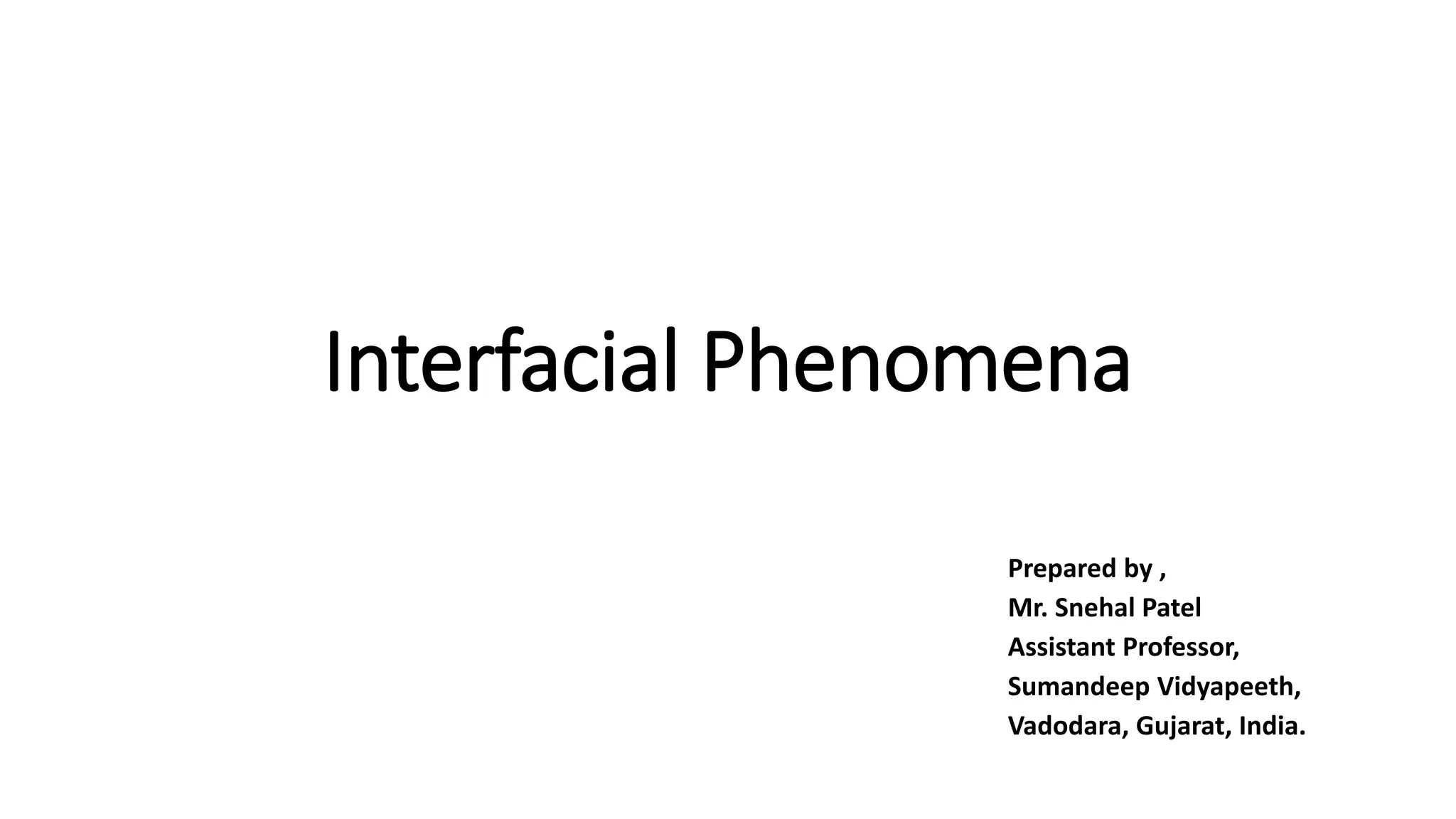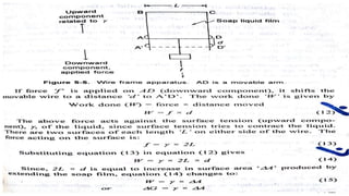 This document discusses interfacial phenomena such as surface tension, capillary rise, and wetting. It defines surface tension and explains how it is responsible for processes like droplet formation. It describes methods to determine surface and interfacial tension, including the capillary rise and Du Nouy ring methods. It also discusses concepts like surface free energy, spreading coefficients, work of cohesion/adhesion, and wetting phenomena. Wetting is important for processes like granulation, film coating, and dissolution. Surfactants can aid wetting by lowering interfacial tension and contact angles.
