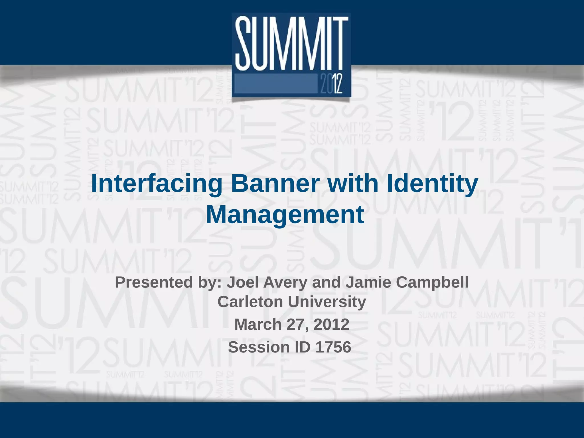 This document presents an overview of implementing Banner with identity management at Carleton University, detailing the goals, project scope, experiences, and key components of the 'mycarletonone' project. It covers data flow architecture, performance experiences with Banner Enterprise Identity Services (BEIS), and role-based provisioning nuances. The overall rollout was successful and additional functionalities were added post-launch, with a specific focus on efficient identity management and account synchronization.